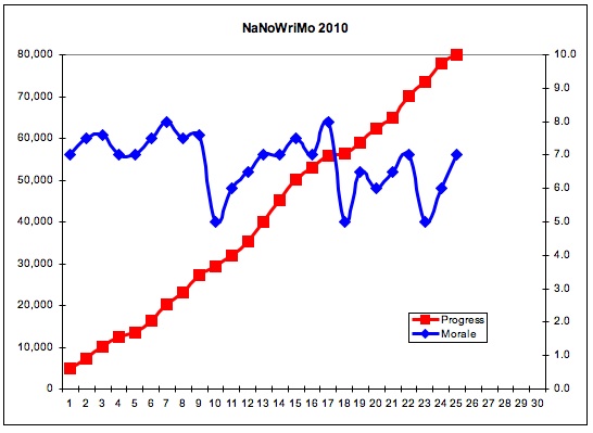 Nov 25: Took a breather at the 80,000 mark to get ready to serve food to the homeless and later I'll be preparing Thanksgiving dinner at home for the fam. Have a happy turkey day everyone!!! (80,080 words)