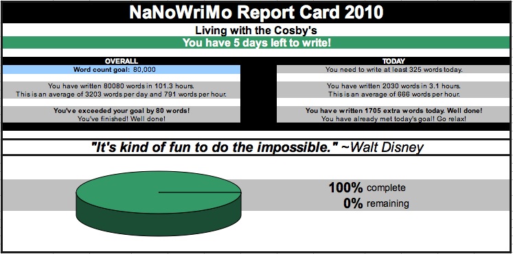 Well, I did it and just in time for turkey! Although I achieved my word count goal for NaNoWriMo for the month of November, it turns out I am far from done with the first draft. I have roughly fifteen more chapters to write which at the rate I'm going will yield a manuscript of roughly 115,000 words. I didn't think I had that many words in me, but I guess I did.